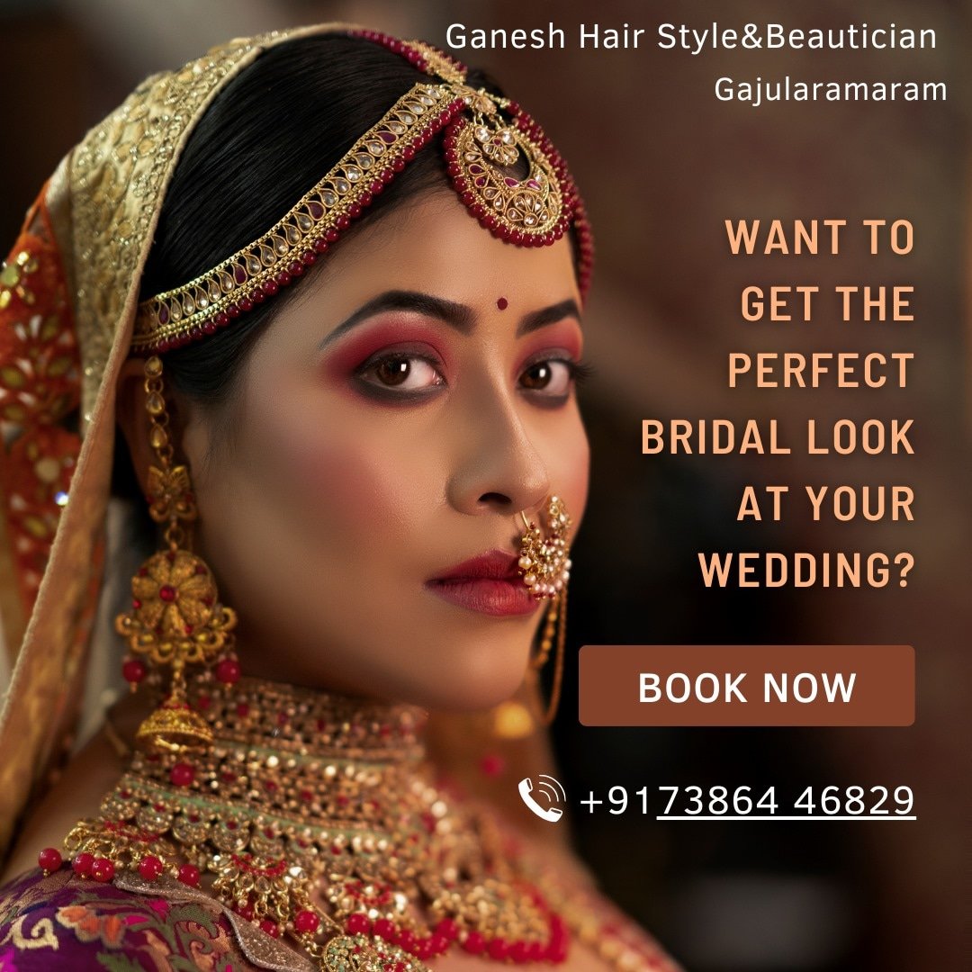 Ganesh Hair Style & Beautician Services – Hyderabad’s trusted beauty destination for Bridal Makeup & Grooming. We specialize in Bridal Makeup in Hyderabad, creating flawless looks for weddings, receptions, and special occasions. From traditional bridal makeup to natural and HD makeup styles, our expert makeup artists ensure you look stunning on your big day. Our services include Shahnaz facials (Gold & Diamond), skin care, hair spa (for dandruff, hair fall & smoothing), pedicure & manicure, mehendi, waxing, hair colors, and professional haircuts for gents, ladies, and kids. Looking for the best bridal makeup artist in Hyderabad? We offer affordable bridal makeup packages, customized beauty solutions, and home service across Hyderabad.